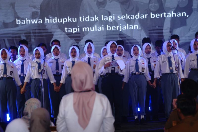 “Penampilan dari anak-anak membuat hati terenyuh, karena mungkin satu atau dua tahun yang lalu mereka tidak pernah terpikir bisa sekolah dengan tenang, bisa tampil di sini, di depan Pak Menteri sambil membaca pusisi dan menyanyikan lagu dengan sepenuh hati, dan dapat menyuarakan cita-cita mereka dan meraih mimpi-mimpi mereka nantinya,” ungkap Wabup Fajar.
