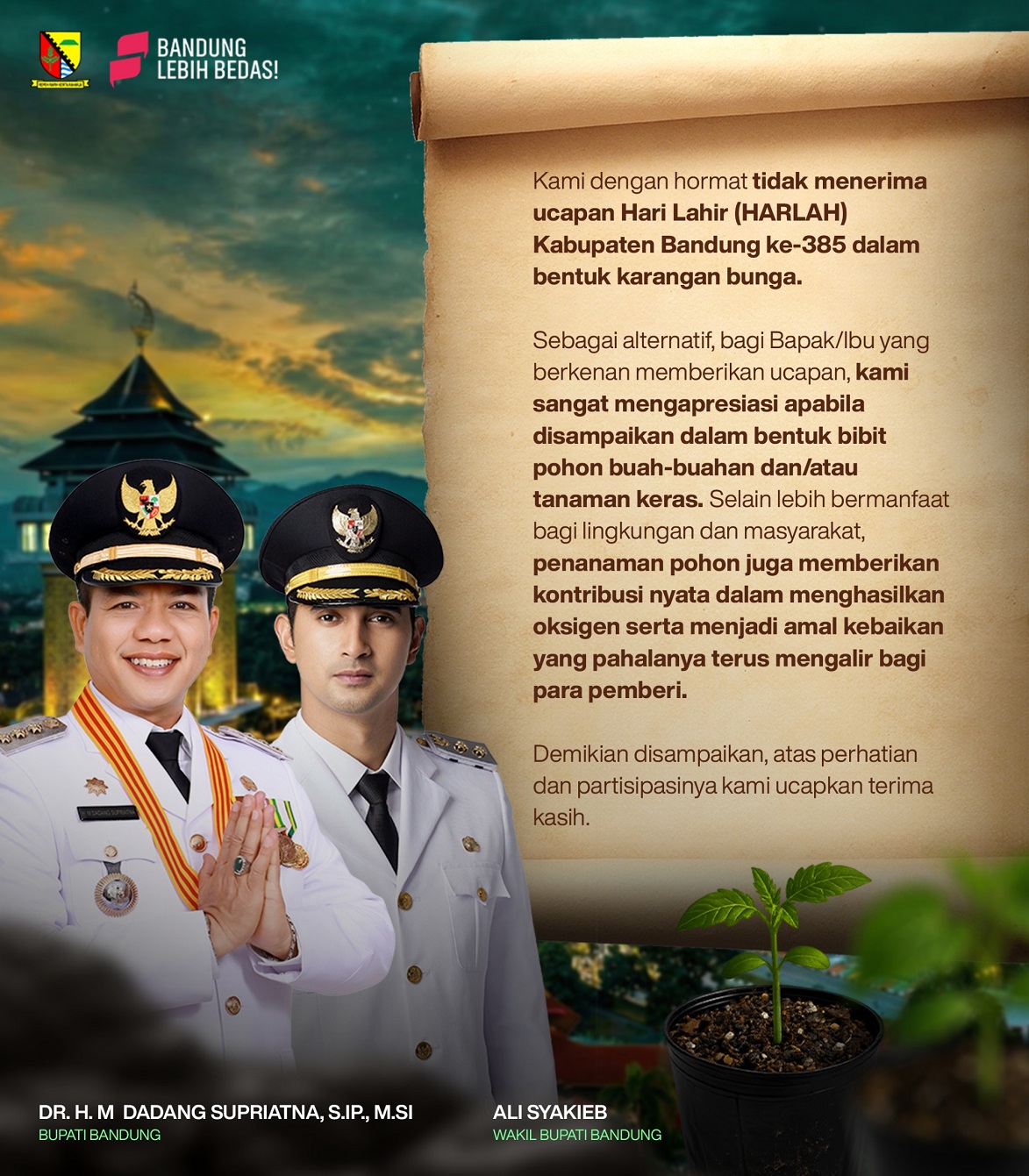 "Setelah kemarin kita putuskan untuk mengalihkan anggaran Hari Jadi Kabupaten Bandung ke-385 untuk penanganan bencana banjir, dengan hormat kami pun tidak menerima ucapan Selamat Jadi Kabupaten Bandung dalam bentuk karangan bunga," imbuh KDS.
